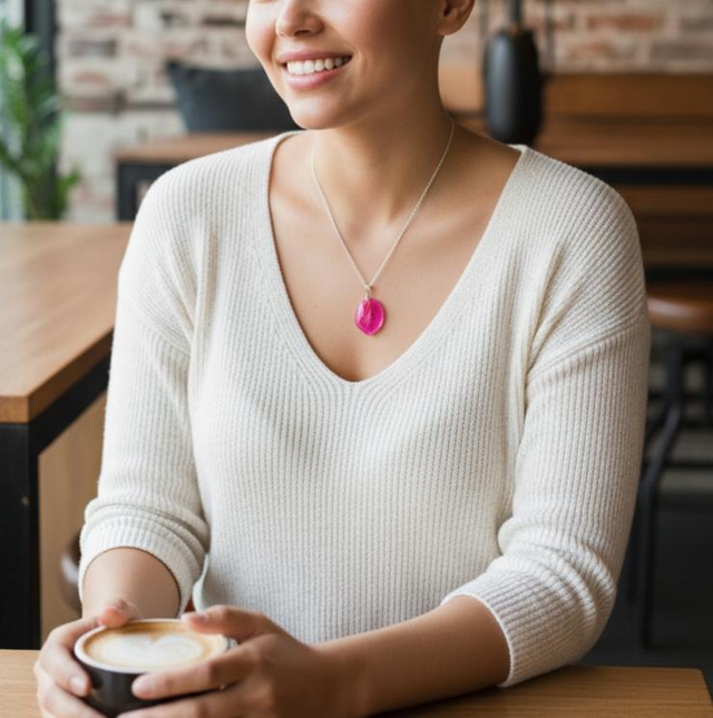 Collar artesanal con flor natural de buganvilla, preservada para conservar su color vibrante. Montado con cadena de acero inoxidable, resistente y duradera.