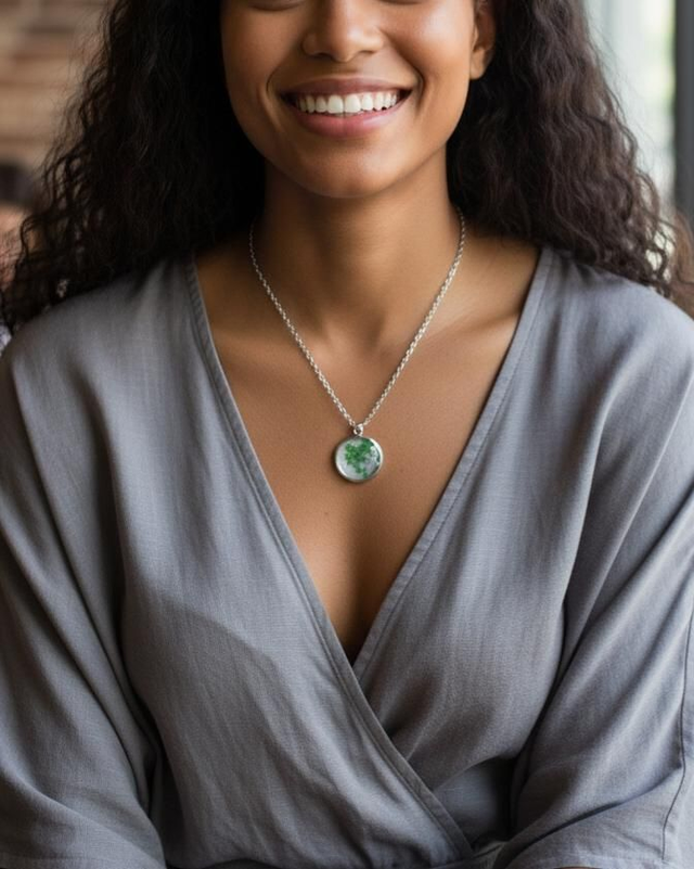 Colgante plateado con fondo blanco y flor natural color azul